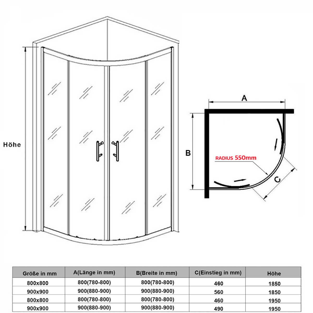 Cabine de douche Paroi de douche ronde Porte coulissante ESG Porte en verre 80/90/100cm Hauteur 185cm /195cm