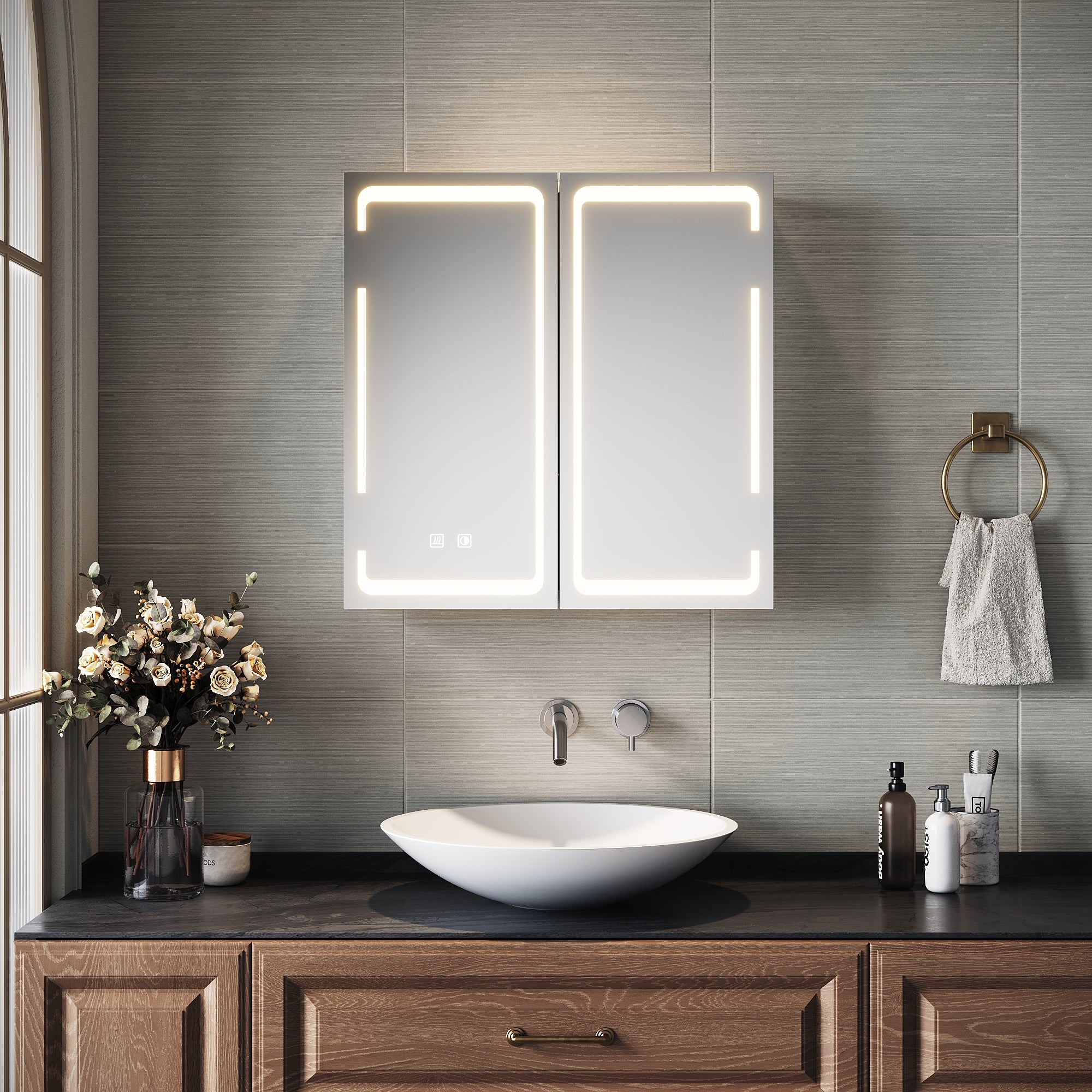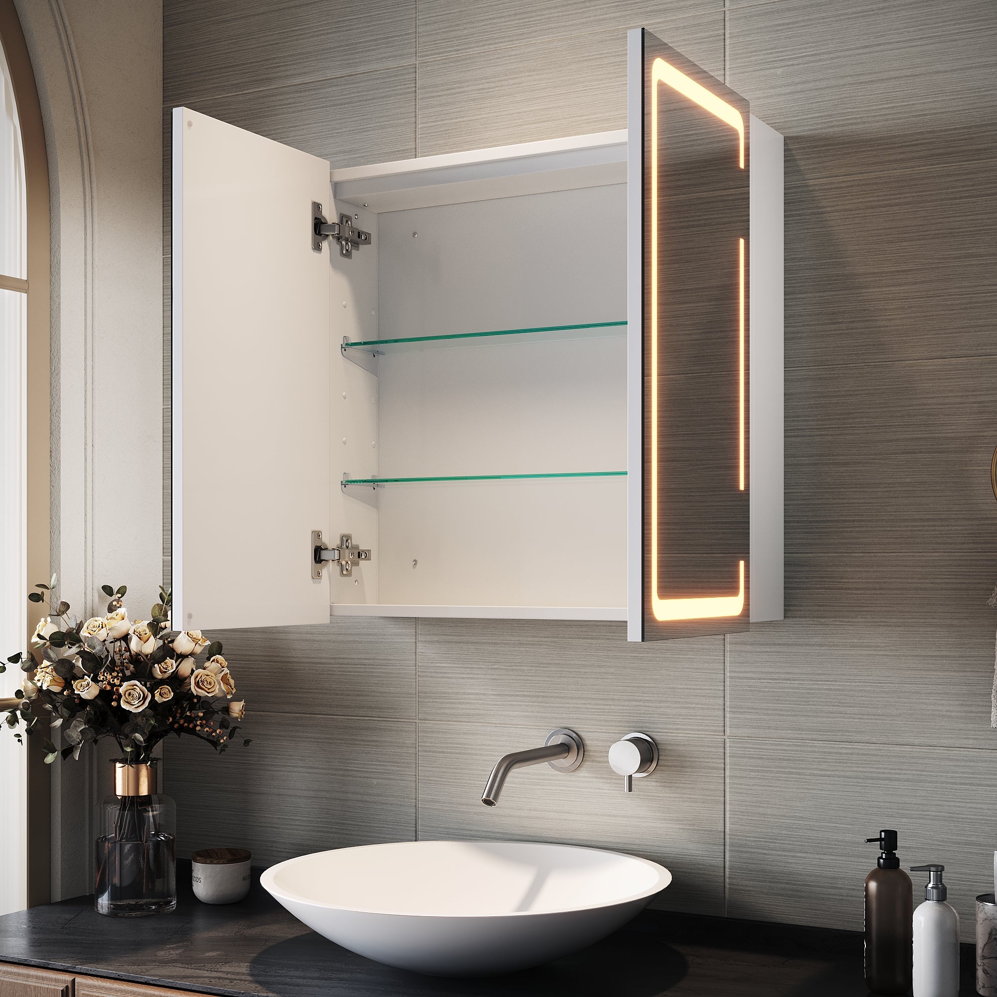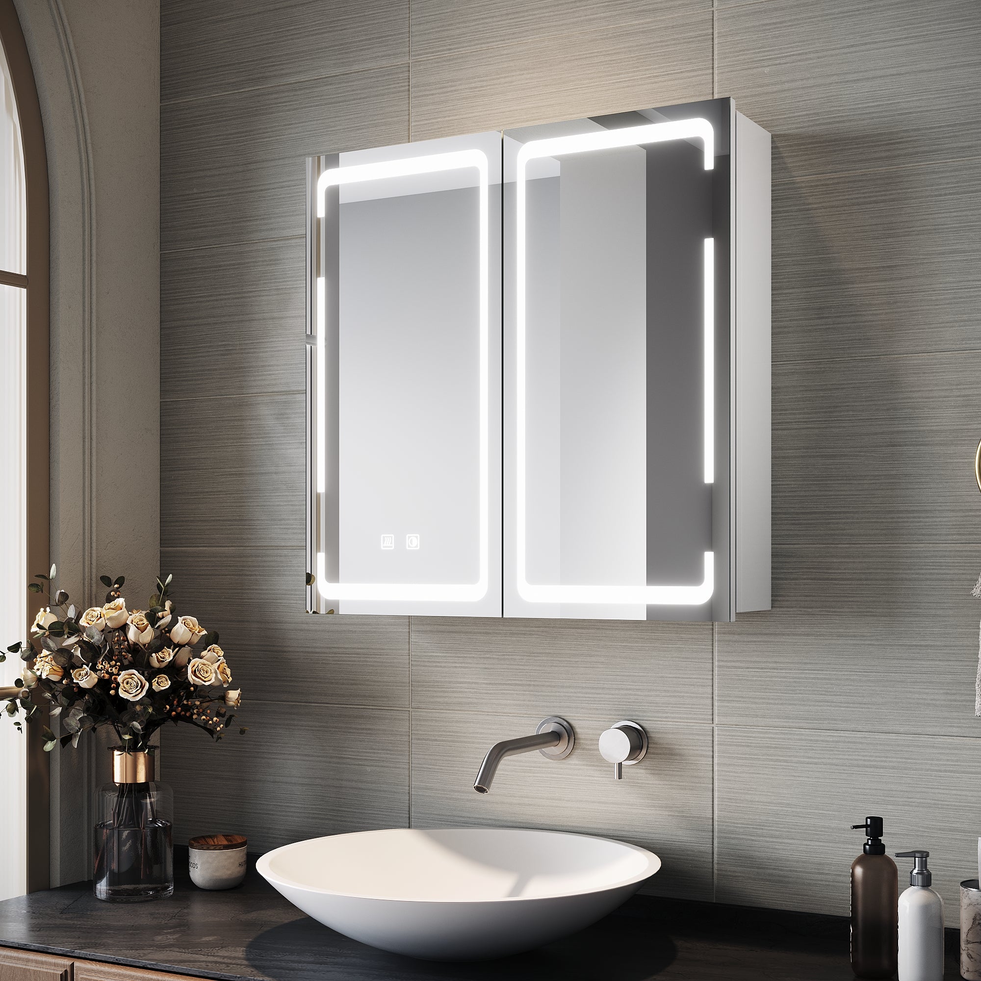 • Eclairage réglable en continu : 10 % à 100 % de l'éclairage de la façade de l'armoire à pharmacie éclairée peuvent être réglés par une longue pression sur le bouton.