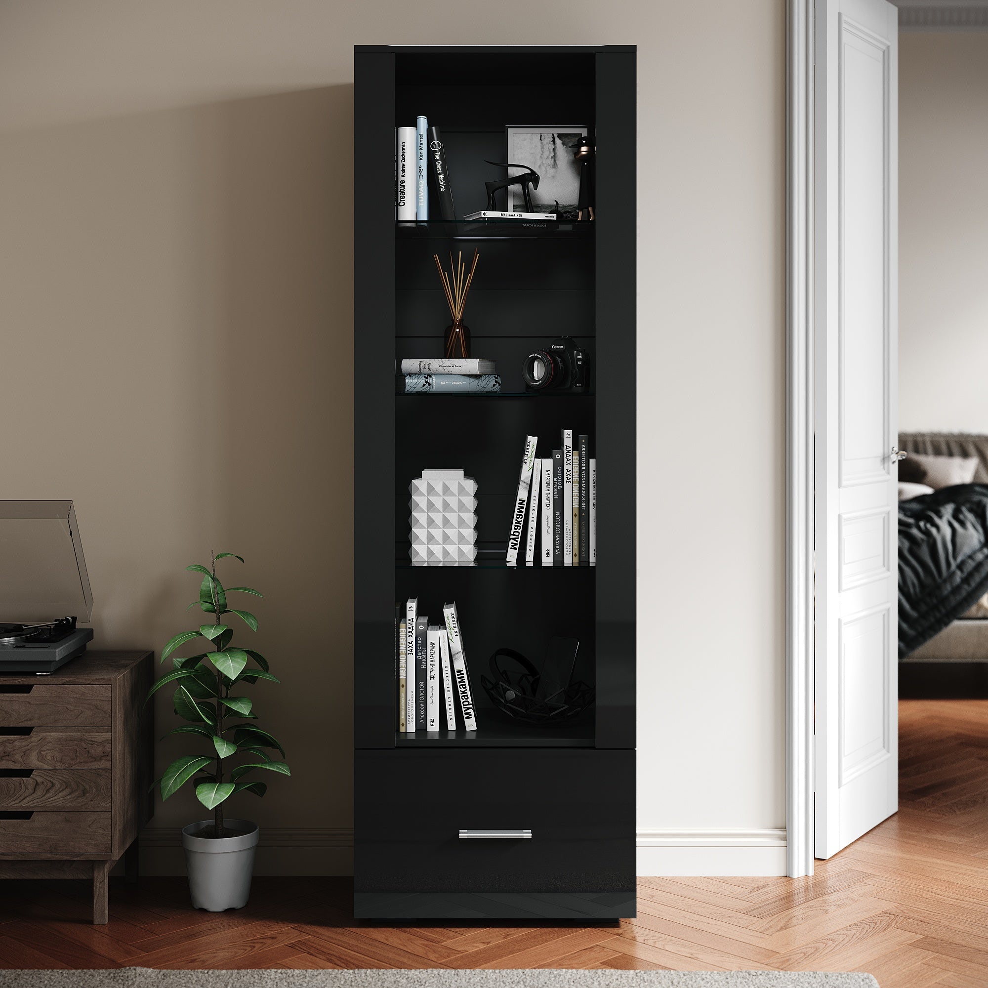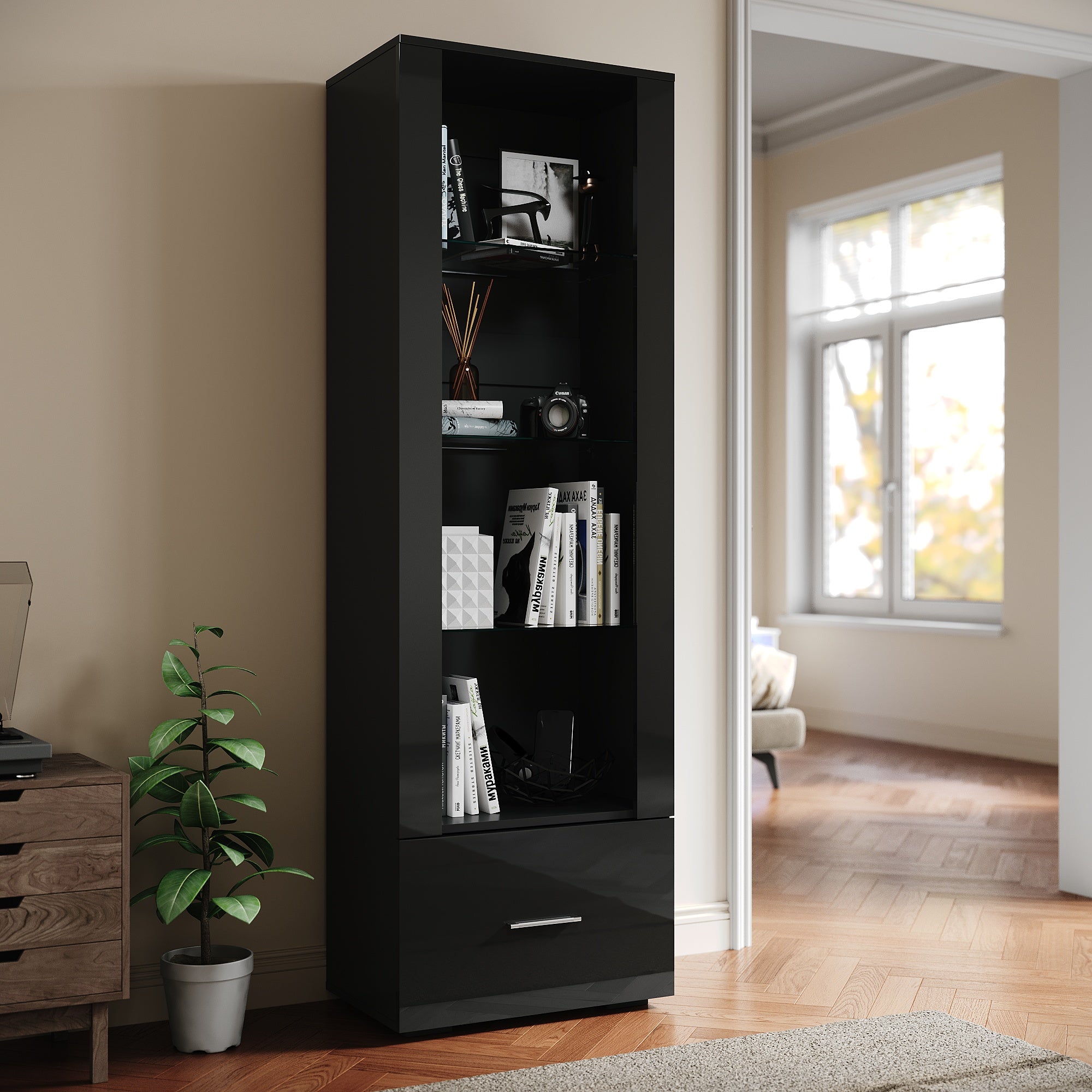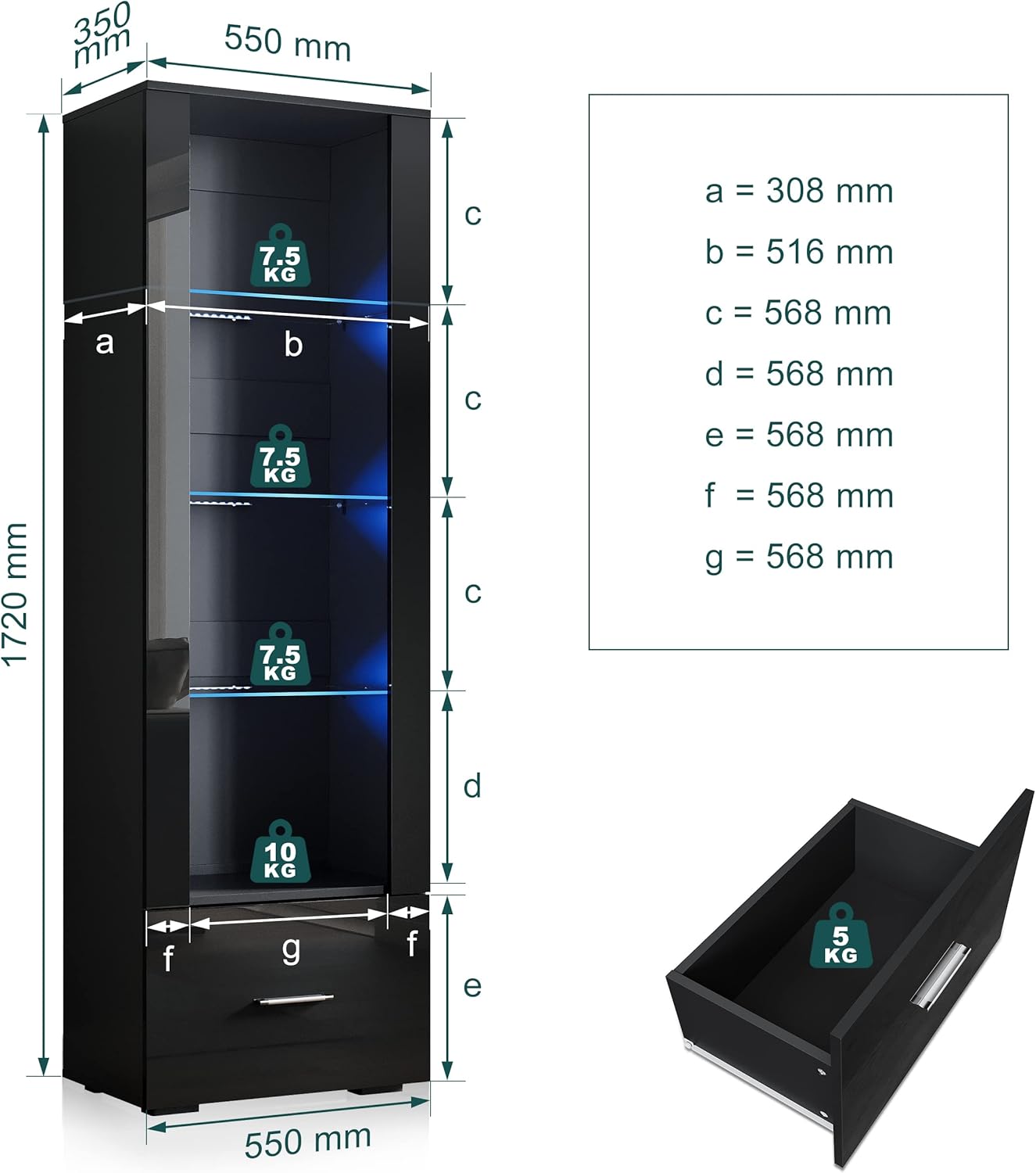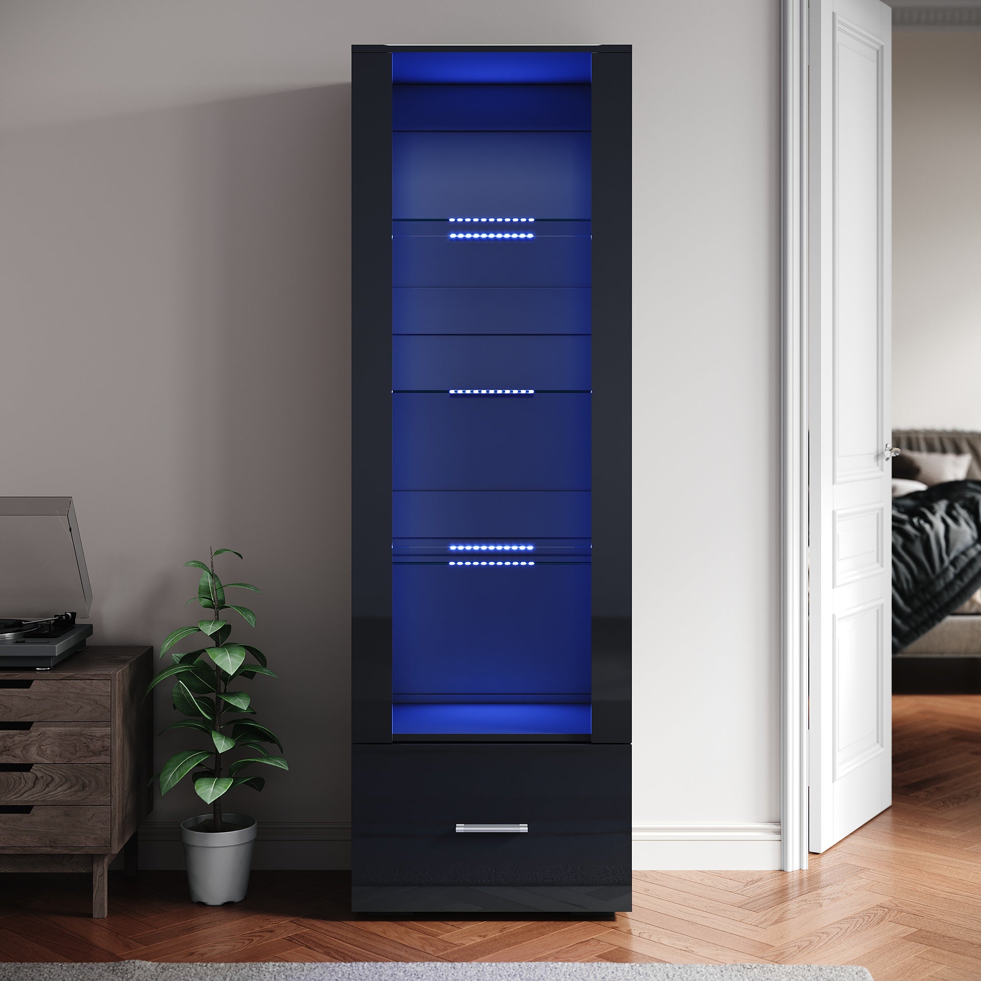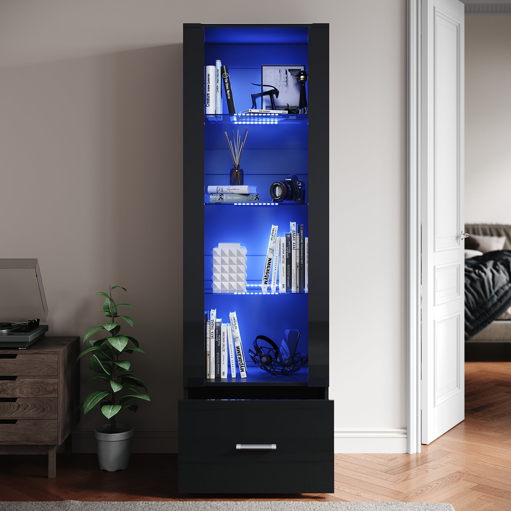 SIRHONA Avec éclairage LED Armoire d'exposition en verre avec tiroirs Façade noire brillante Armoire d'exposition pour collectionneurs 550 x 350 x 1720 mm