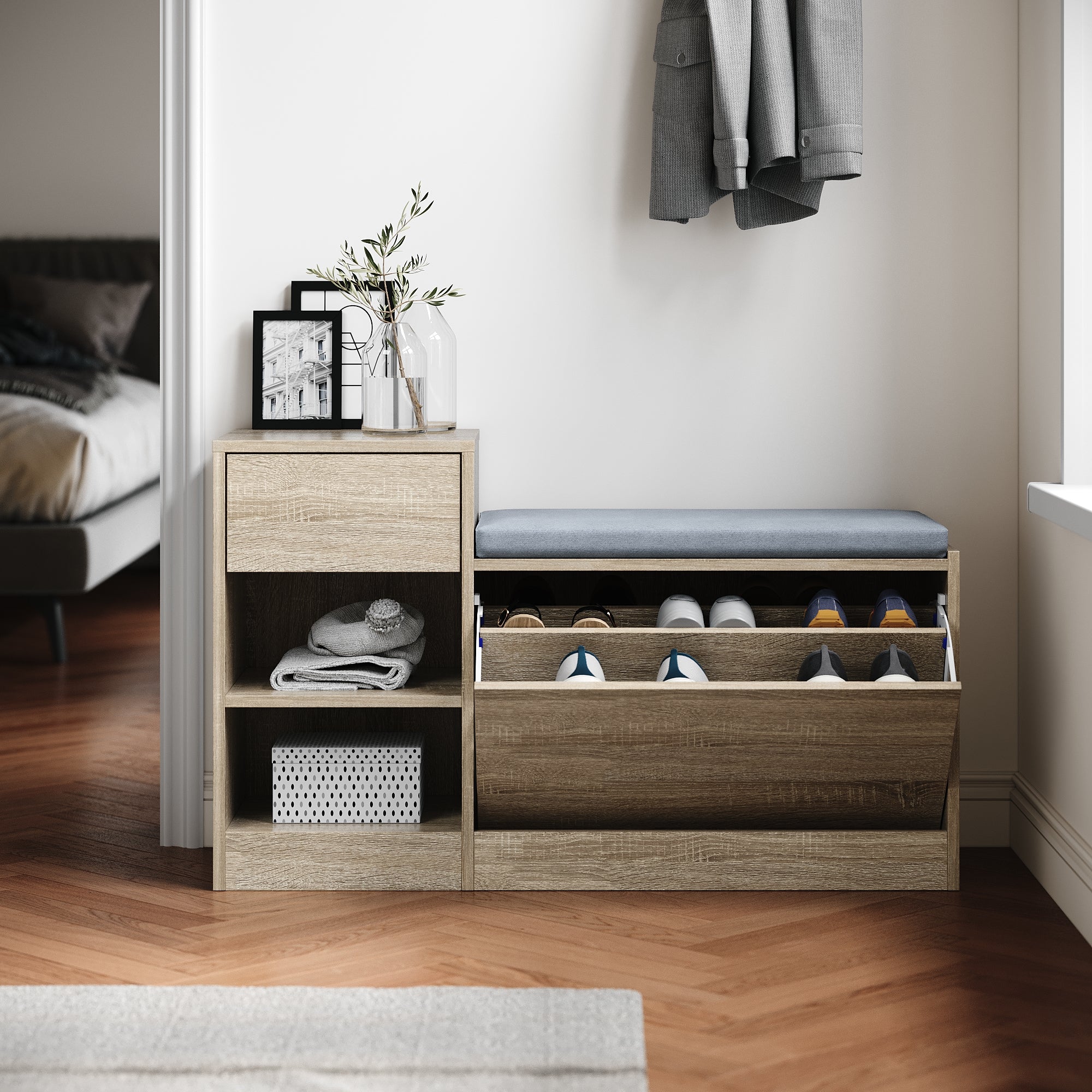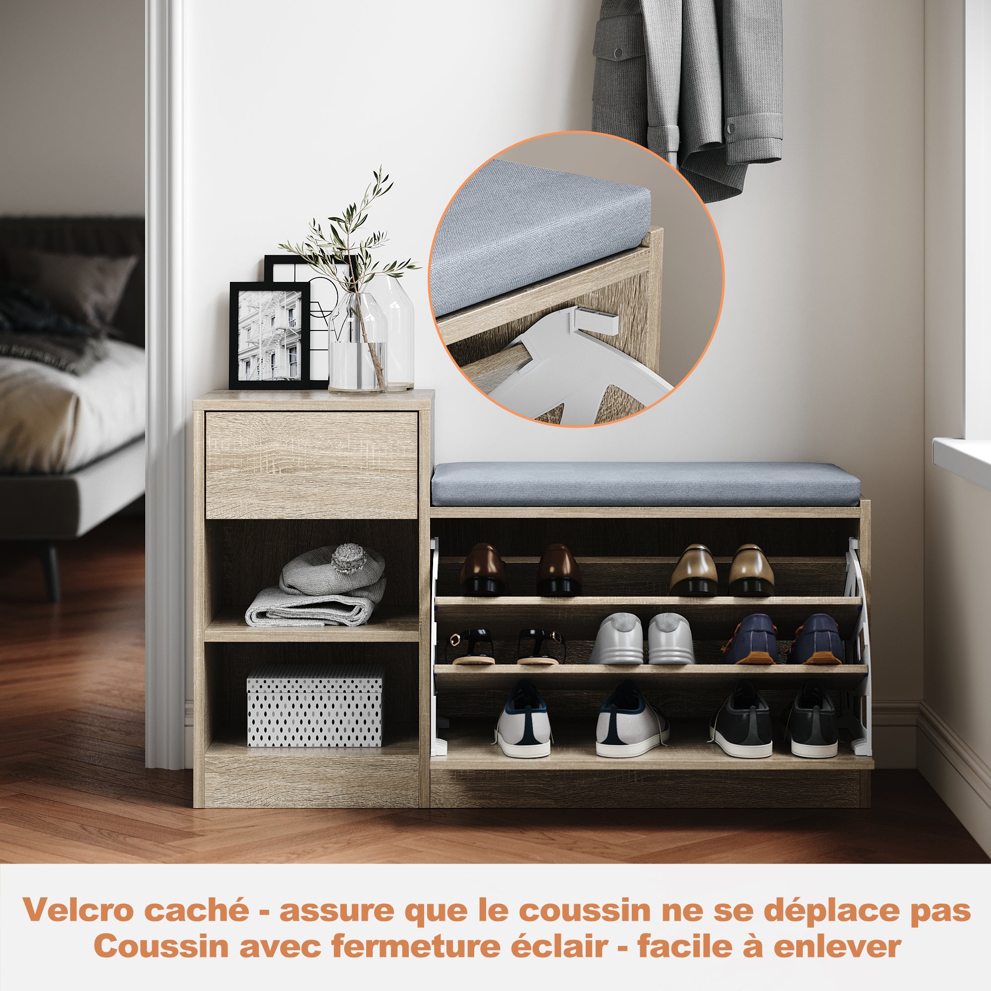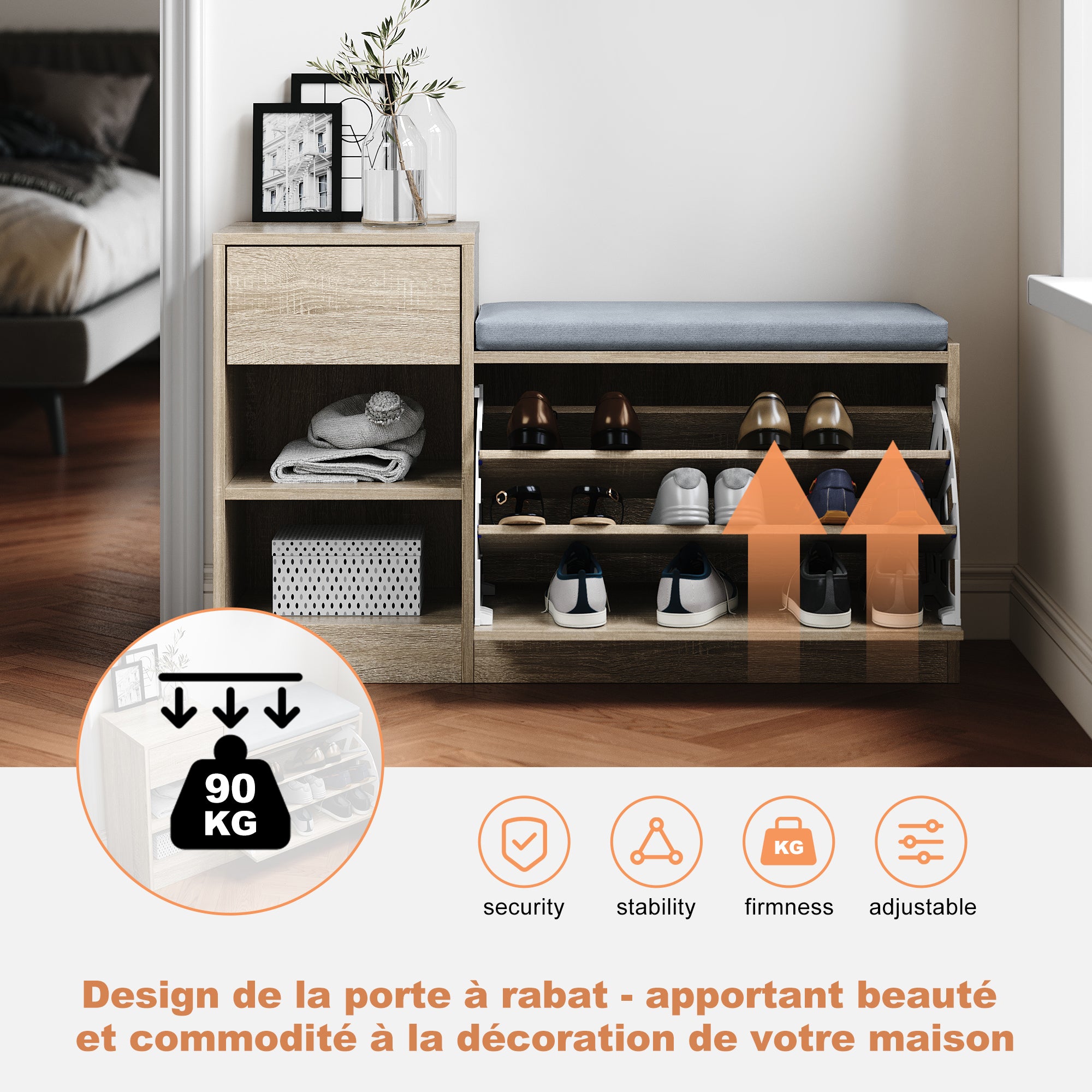 SIRHONA Banc à chaussures avec sièges, Deux compartiments ouverts, avec 1 abattant, avec tiroir, Petite armoire à chaussures 94.5x30x57cm