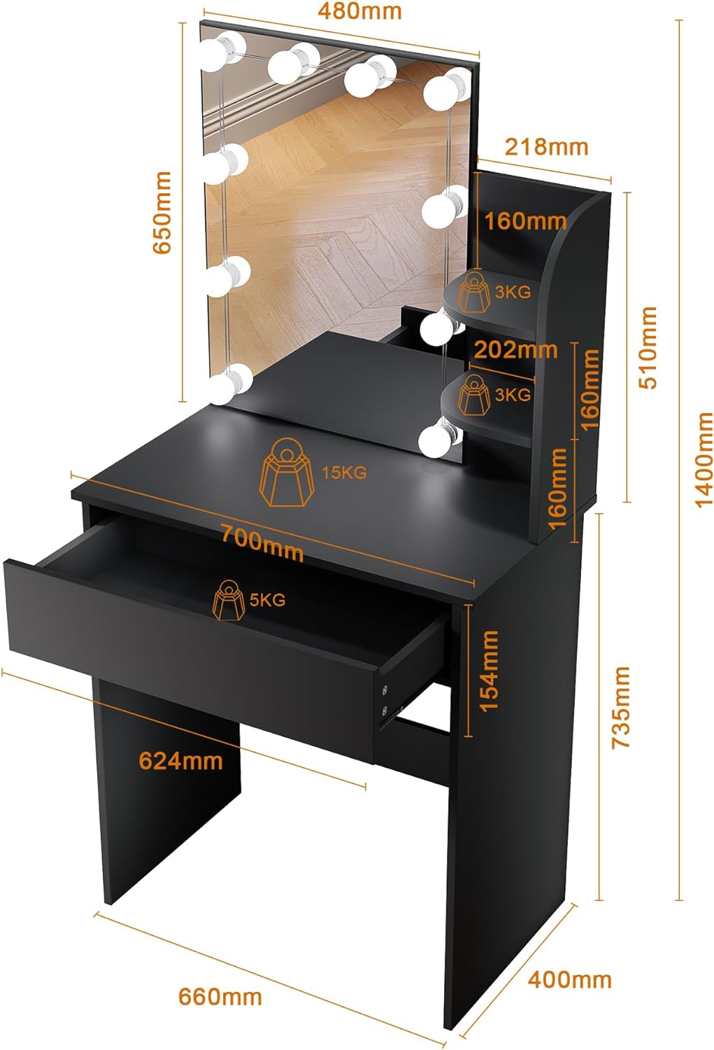 • Un espace de rangement suffisant: Avec un tiroir et 3 compartiments. Beaucoup de place pour les cosmétiques, les bijoux et autres effets personnels.