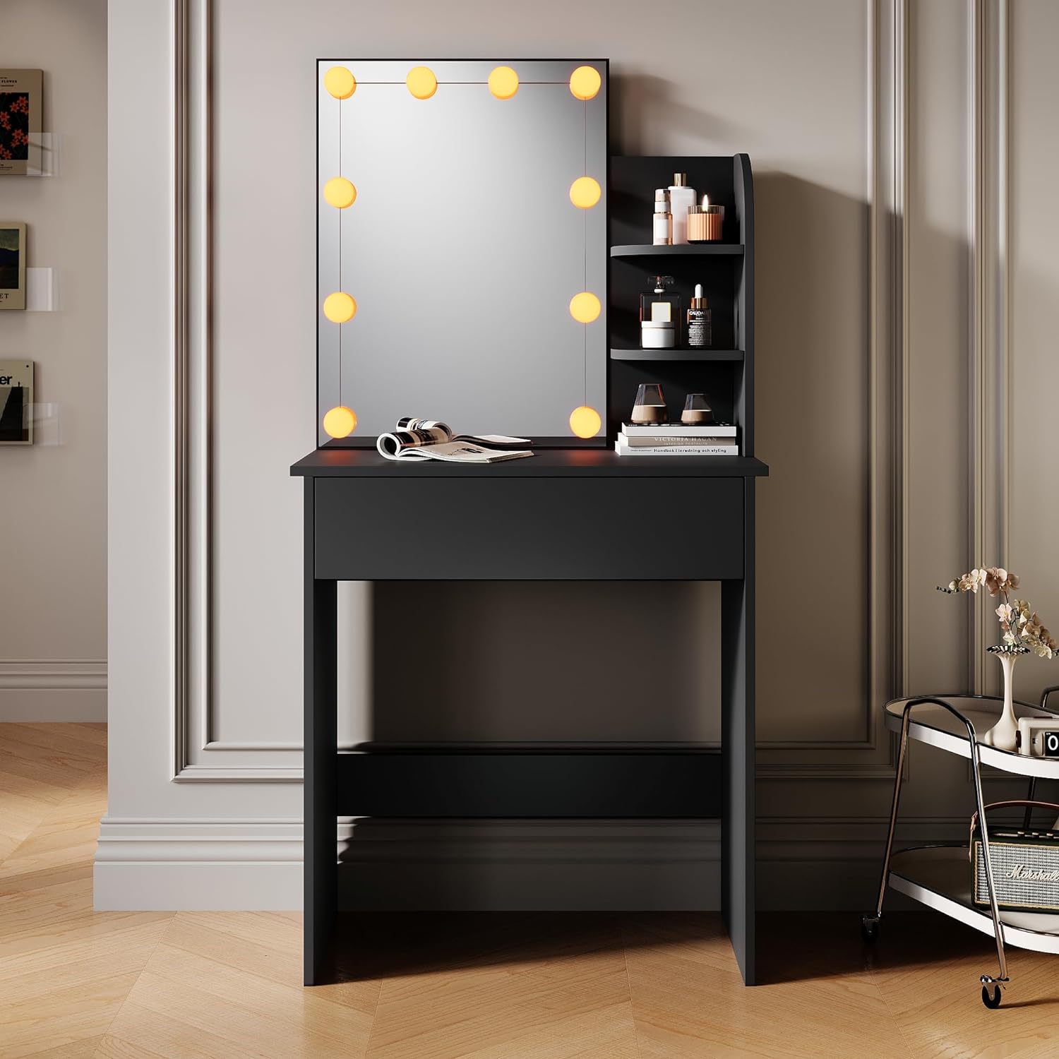 SIRHONA Coiffeuse avec Miroir, Table de maquillage avec 1 tiroir et 3 Compartiments Ouverts, Noir + 10 Ampoules LED (3 couleurs)