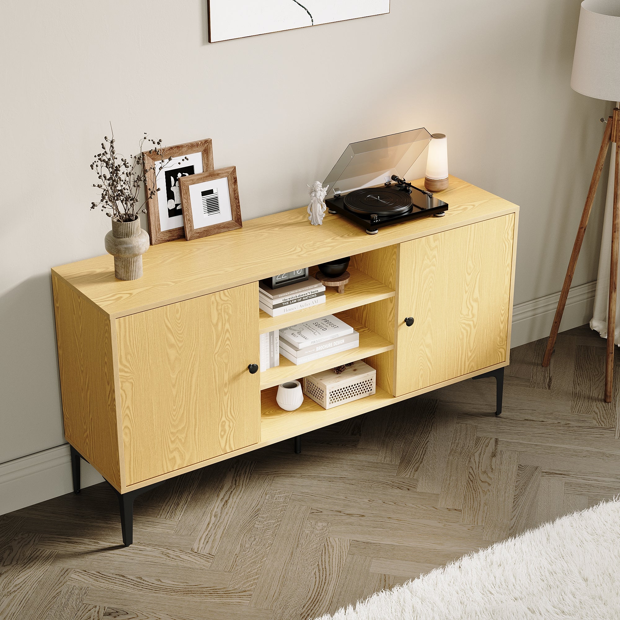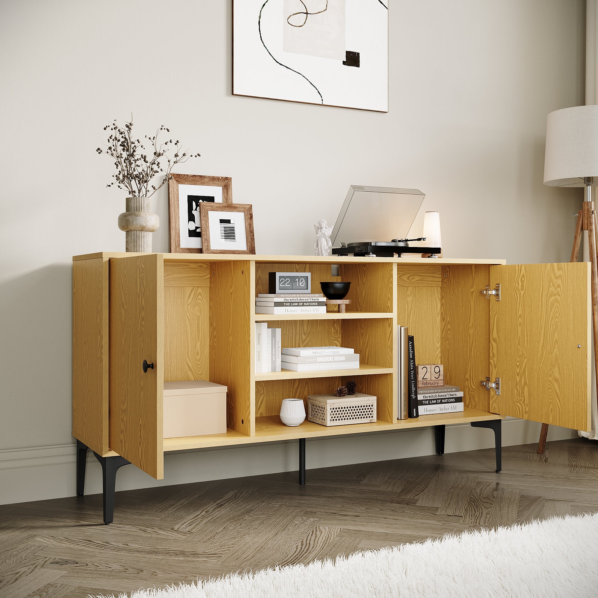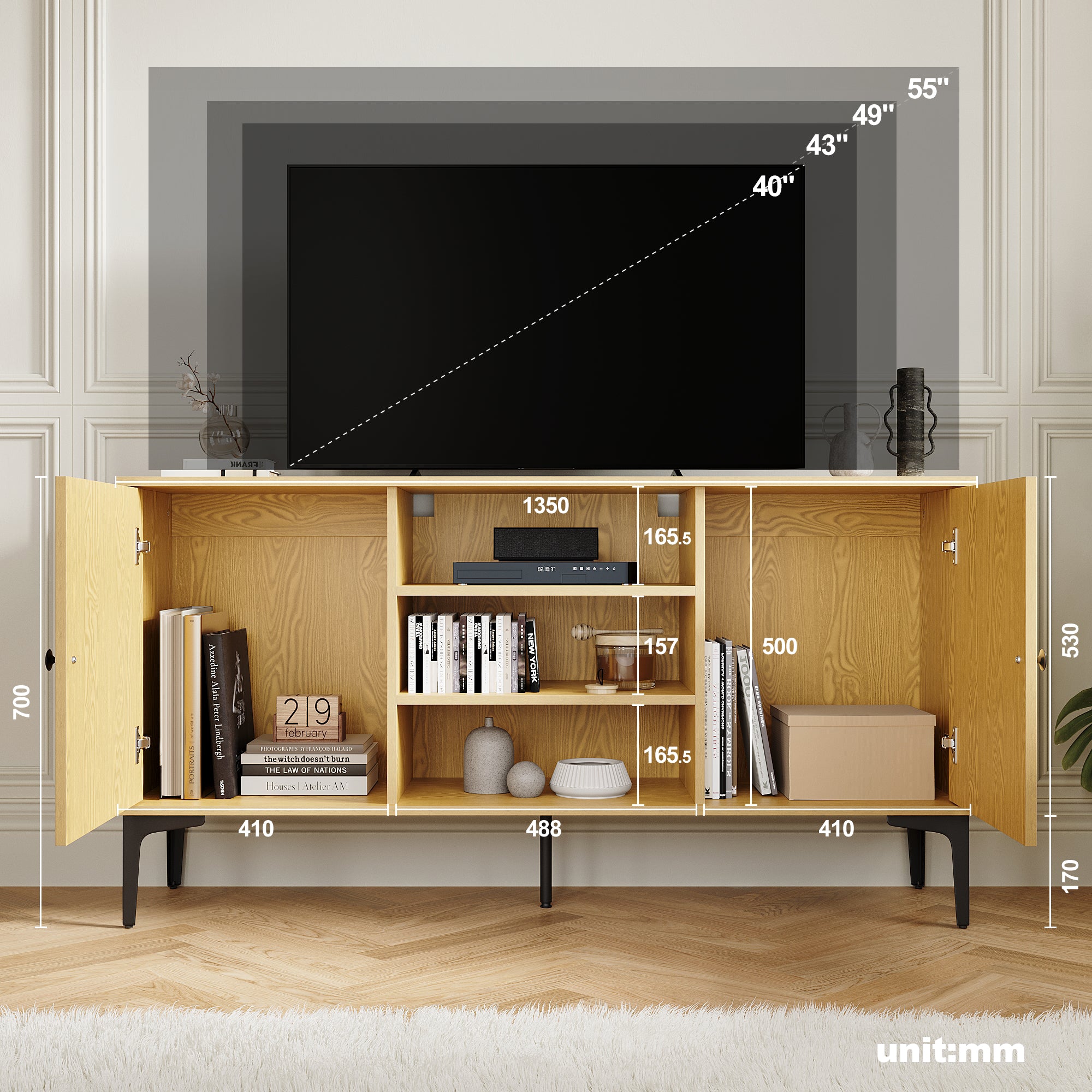 • Grande capacité de stockage: Ce meuble TV a un design très pratique et offre beaucoup d'espace de rangement. 5 armoires offrent amplement d'espace de rangement au salon.