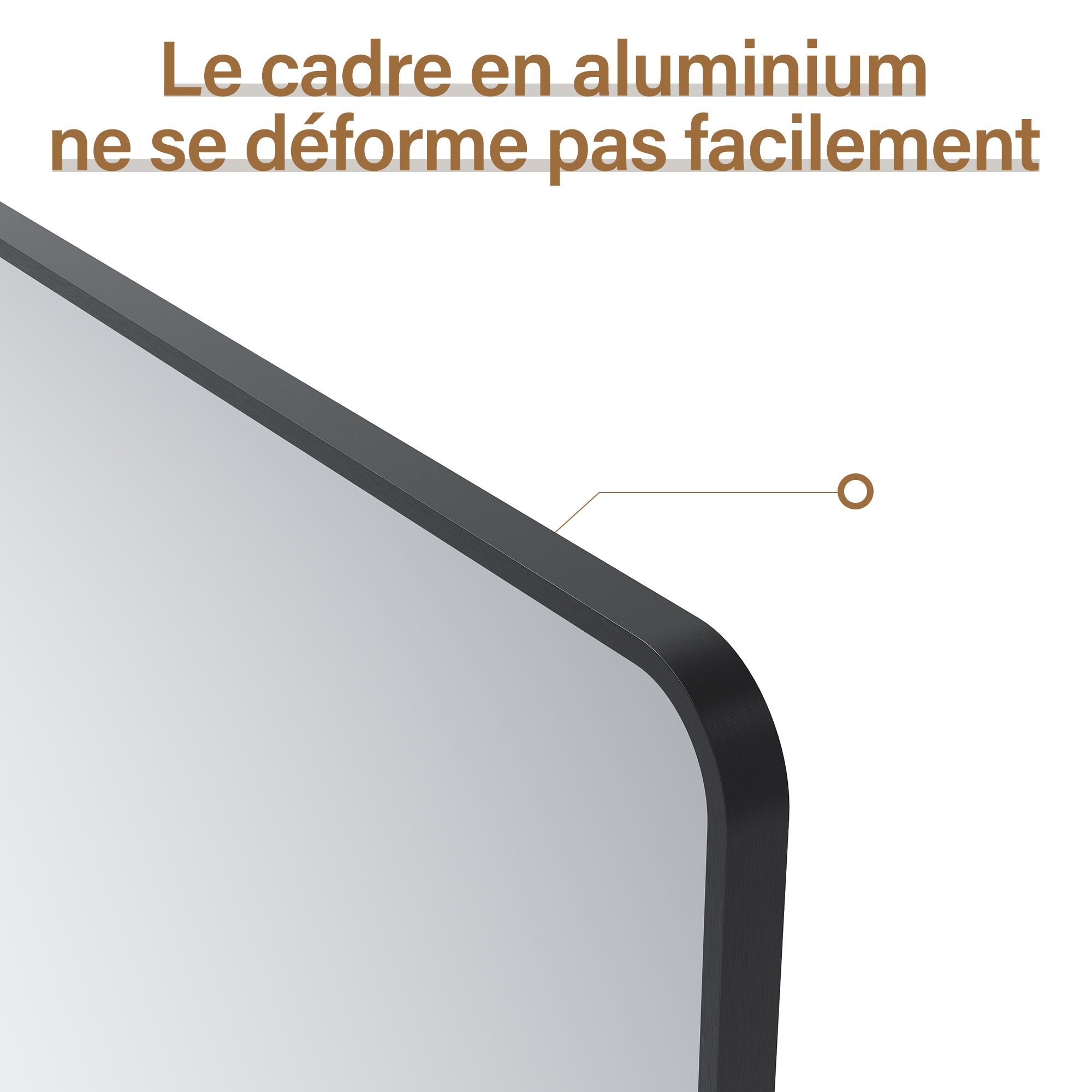 • Cadre en aluminium de haute qualité-Le cadre du miroir est fabriqué en aluminium robuste, garantissant durabilité et stabilité. La surface est traitée avec un revêtement en poudre noire, ce qui améliore non seulement la résistance à la corrosion, mais donne également au cadre une apparence élégante et minimaliste.
