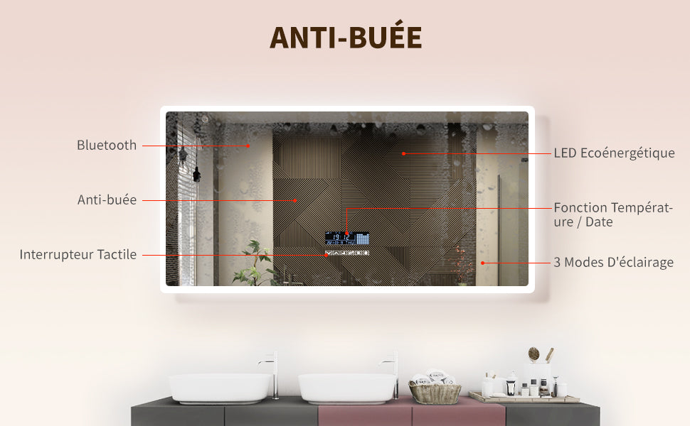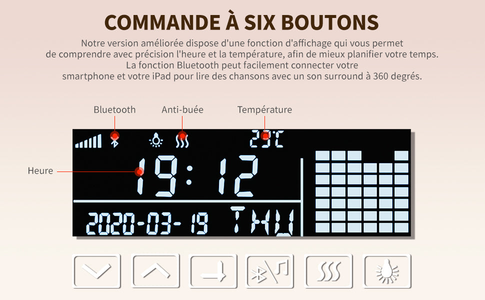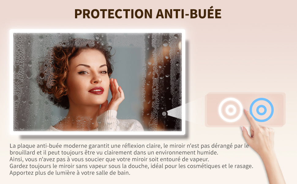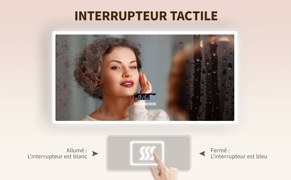 • lnterrupteur de commande tactile: lumière et l'anti-buée activent en même temps après avoir appuyé sur un bouton tactile, plus pratique que les doubles boutons. La fonction anti-buée peut être démarrée séparément.