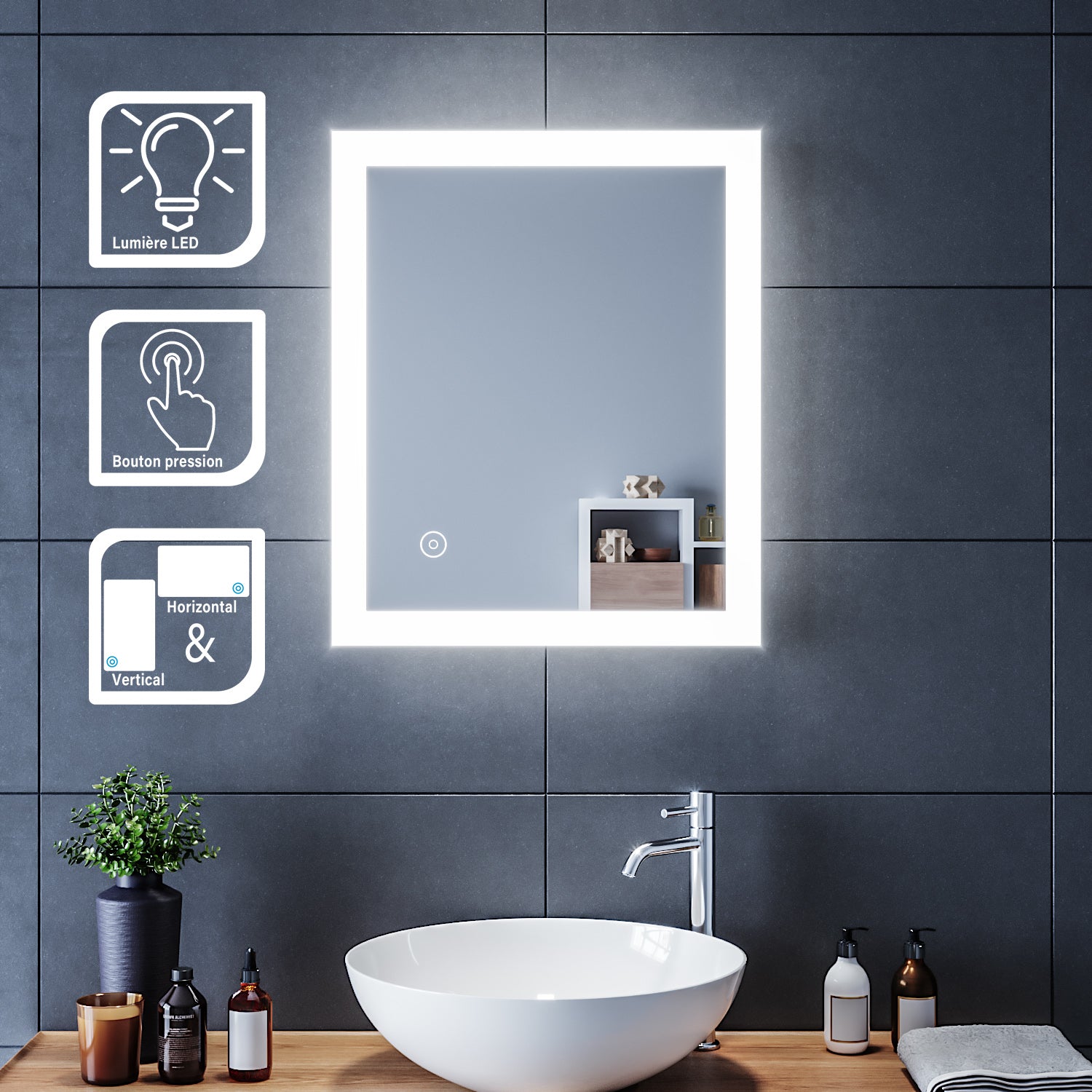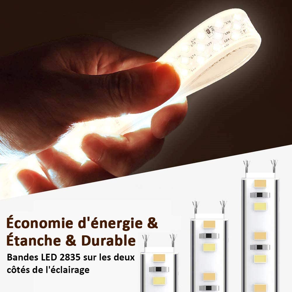 • LED à économie d'énergie, à commande miroir avec connexion au secteur, pas de batterie.