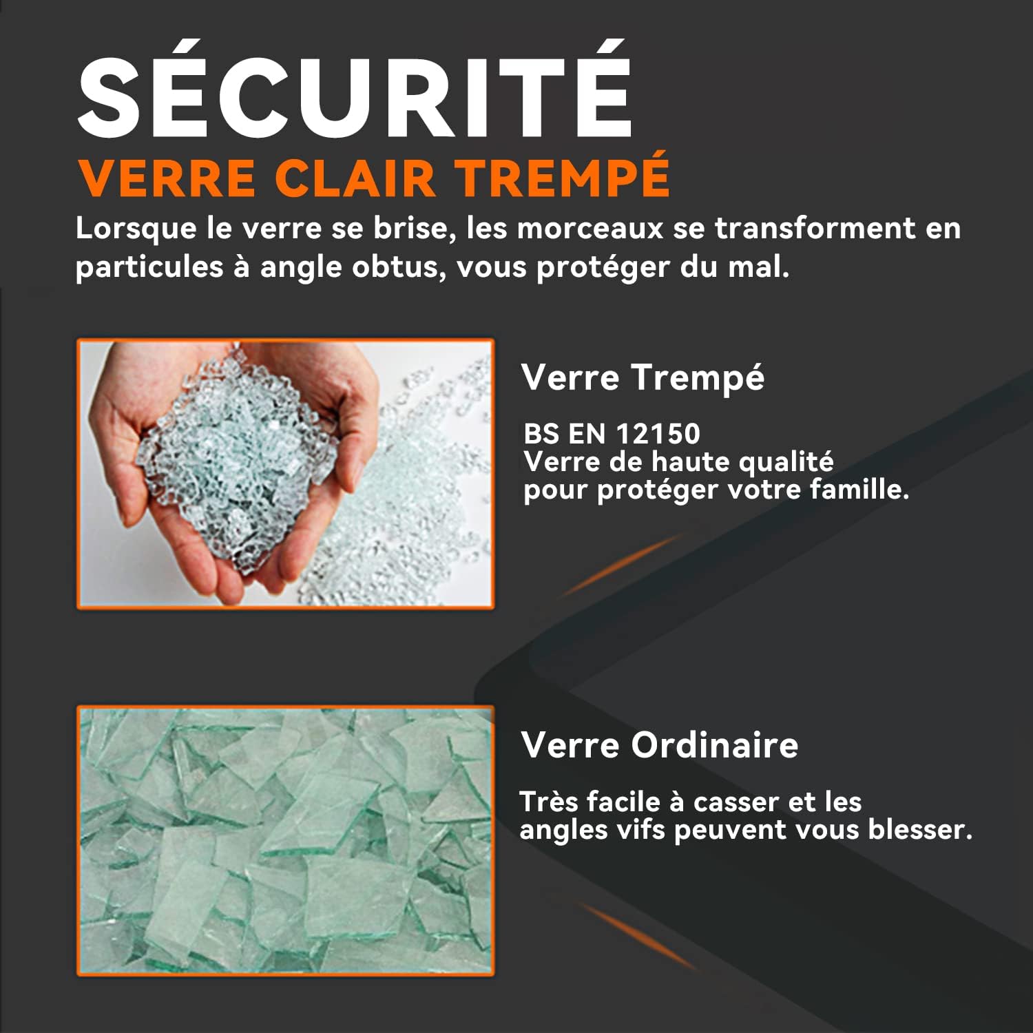 • Verre Sécurit de 8 mm, certifié par la norme BS EN 12150.