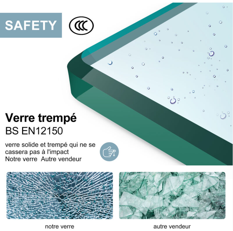• Verre de sécurité trempé (ESG) 5 mm, certifié conforme à la norme BS EN 12150.