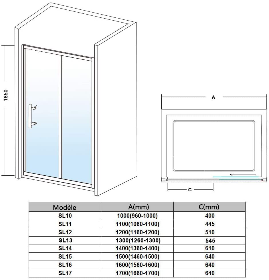 SIRHONA Porte de Douche Coulissante, 100-170cm x 185cm, 5mm verre trempé, installation En Niche